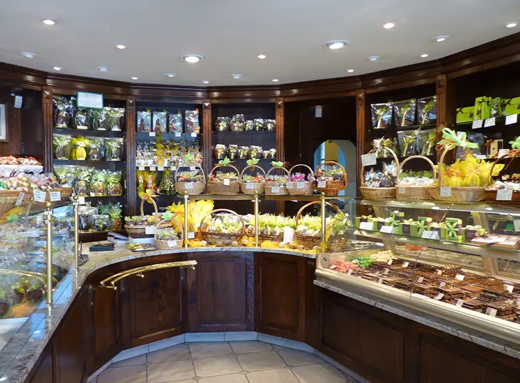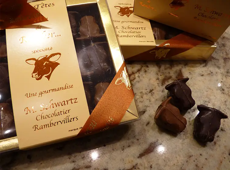 Au rayon chocolat, pur beurre de cacao, c’est un enchantement, Frédéric Schwartz concocte de nombreuses gourmandises : des croq’télé, des Rocailles des Vosges, du nougat au miel de Lorraine, des pâtes de fruits du terroir.